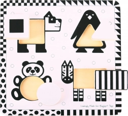 A BIGJIGS TOYS fekete-fehér betétes kirakója kifejezetten a legkisebbek számára készült. A kontrasztos kivitel segíti a babákat az élesebb fókuszálásban és a formák észlelésében, míg a négy, nagy méretű fa elem állatmotívumokkal kényelmesen behelyezhető a megfelelő nyílásokba.
