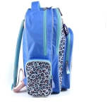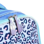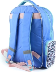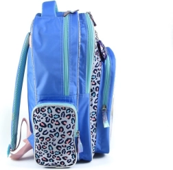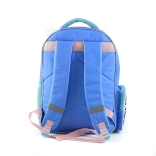 A hátizsák kék-lila árnyalatokkal és aranyos mintákkal készült, ami játékos és kedvelt kiegészítővé teszi a gyerekek számára.