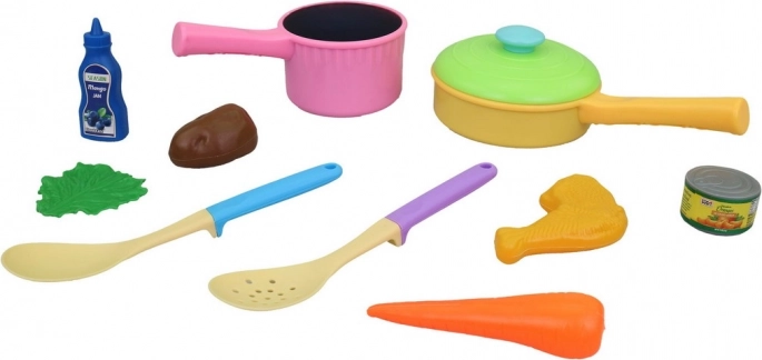 Ez a konyhai készlet tökéletes a kis főzés szerelmeseinek. A 28 x 20 cm-es méret ideális gyerekjátékhoz. Tartós műanyagból készült, biztosítva a biztonságot és a hosszú élettartamot. A csomagolás praktikus, kártyával ellátott zacskóban érkezik, ami lehetővé teszi a könnyű tárolást.