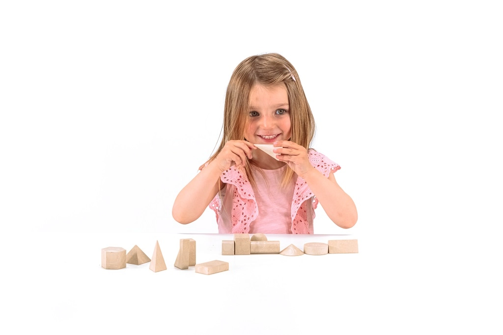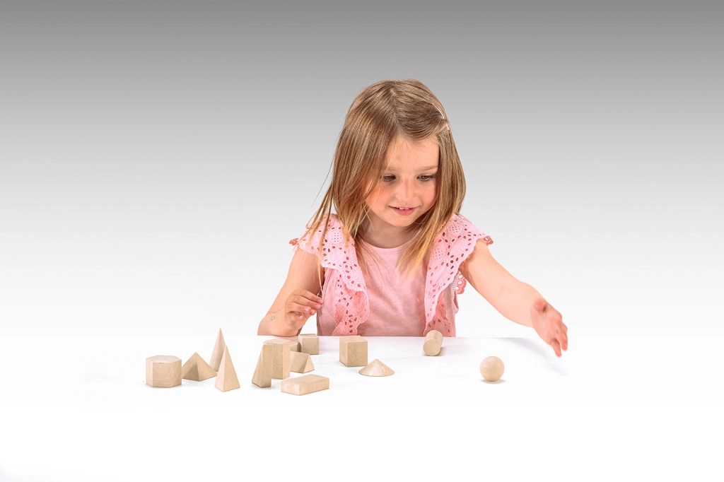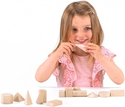 Ez a fa készlet 14 különböző geometriai testet tartalmaz, amelyek ideálisak a korai geometriai tanulásra. A gyerekek megtanulják felismerni az alakzatokat, mint például a kocka, téglatest, prizma, henger, gúla, kúp és gömb.