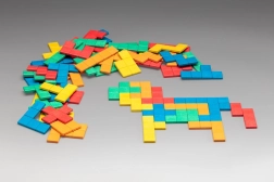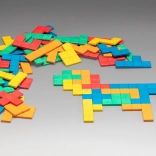 Doboz tele színes pentominókkal a gyermekek kreativitásának és térbeli gondolkodásának fejlesztésére. 60 darabot tartalmaz, melyek 100% újrahasznosított, PEFC tanúsítvánnyal rendelkező fából készültek, tartós kartoncsomagolással együtt.