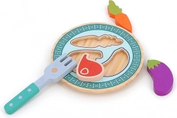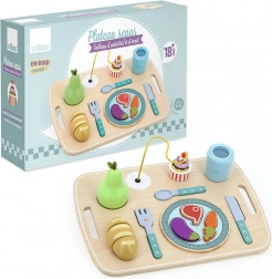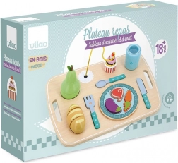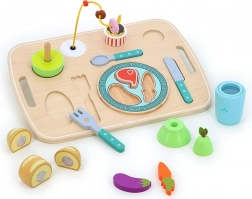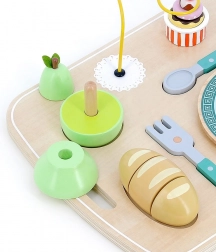 Ez a Vilac márkájú fa tálca különféle tevékenységekkel remek játékélményt nyújt a gyerekeknek a finommotoros készségek és koordináció fejlesztése közben. Tartalmaz egy egymásra rakható körtét, egy vágó kenyeret és egy mozgatható darabokkal rendelkező fagyit. Ideális gyermekkezek számára.