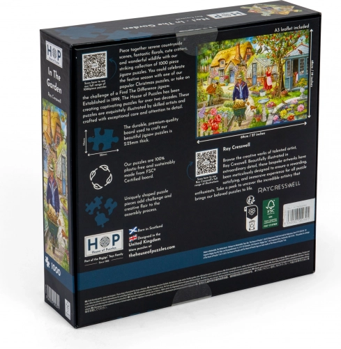 Puzzle HOP a kertben 1000 darabbal, egyedi formákkal, A3 posztert tartalmaz. Méretek: 69 x 48 cm.