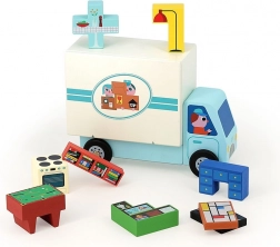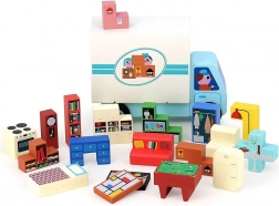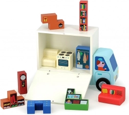 A készlet tartalmaz egy fa költöztető autót és 19 darab bútorblokkokat, ideális önálló vagy közös családi játékra.