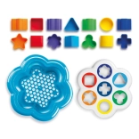 A készlet 14 színes elemet tartalmaz 7 különböző formában, valamint egy praktikus, tetővel ellátott virág alakú dobozt, amelybe a játék végén mindent könnyedén vissza lehet pakolni. A tartós, könnyen mosható, biztonságos műanyag hosszú élettartamot garantál.