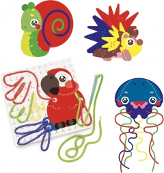 A készlet négy karton állatfigurát tartalmaz (pl. papagáj, sün, csiga, medúza) és nyolc színes fűzőt, amelyek inspirálják az alkotást és a minták kombinálását.