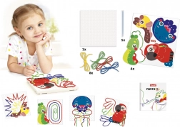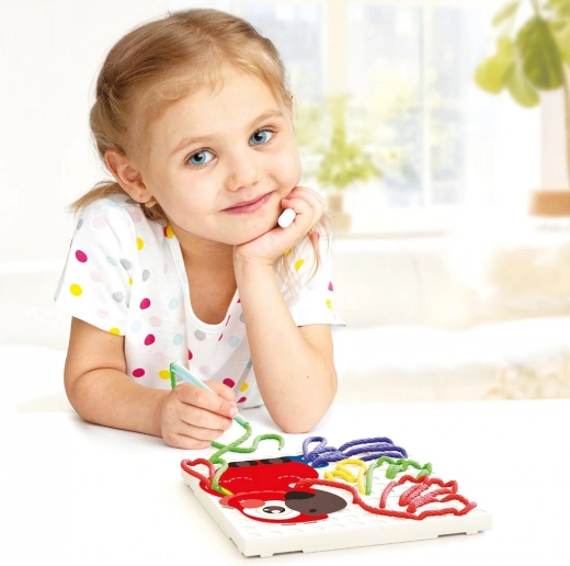 A speciális fűzőtoll lehetővé teszi, hogy a gyerekek biztonságosan és kényelmesen vezessék a fűzőt a tábla nyílásain át. A nyílás a toll kihúzása után stabilan megtartja a fűzőt, így a minták nem esnek szét.