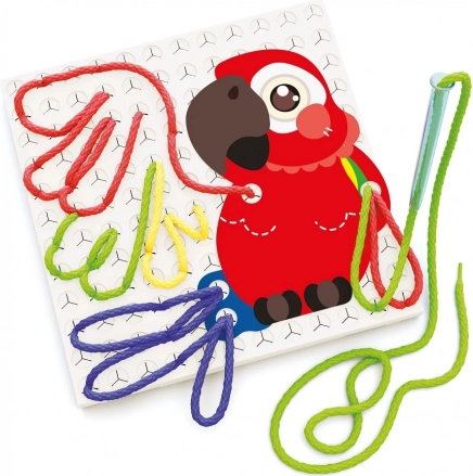 Tartalmaz egy strapabíró fűzőtáblát papagáj mintával, négy masszív karton állatfigurát és nyolc színes zsinórt kialakított végekkel a könnyű kezelhetőségért. A készlet ideális otthoni alkotáshoz és óvodákba egyaránt, és egyszerre támogatja a motorikát, a helyes fogás gyakorlását és a vizuális észlelést.