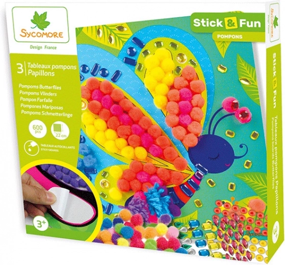 Stick & Fun kreatív készlet 3 éves kortól gyermekeknek, amely lehetővé teszi a pillangó motívumú képek díszítését színes pomponokkal és öntapadó kövekkel, ezáltal fejleszti a kézügyességet és a kreativitást.