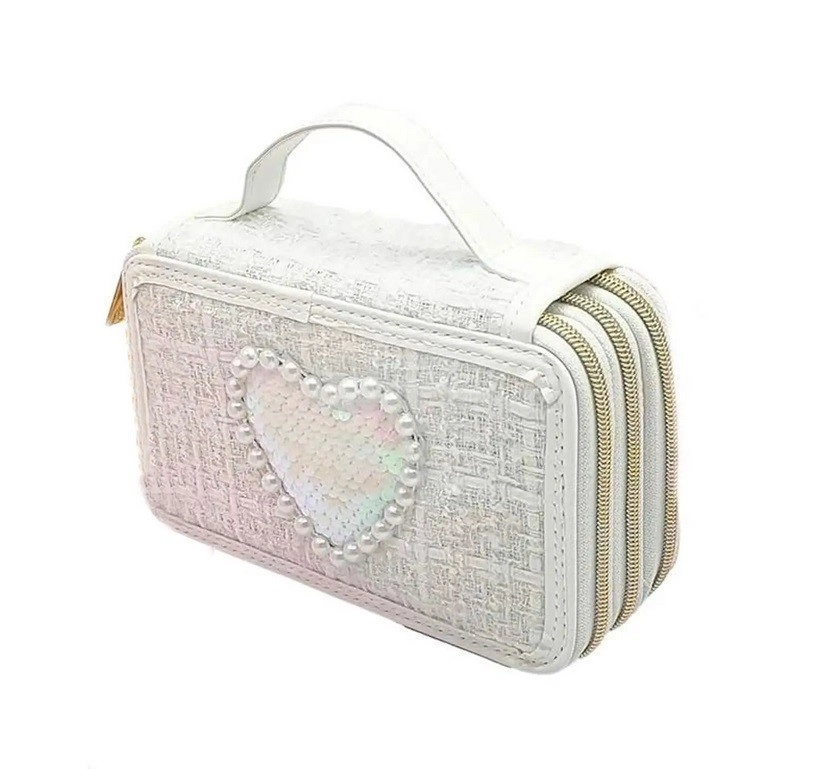 Stílusos Girabrilla tolltartó háromlépcsős kialakításban divatos tweed szövetből tervezve. Fehér gyöngyös díszítés és fényes szívecske ad egyedi megjelenést minden iskolás lánynak, aki szereti ötvözni a divatot a praktikummal.