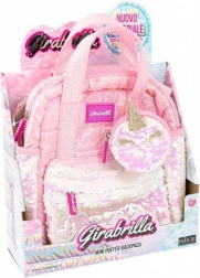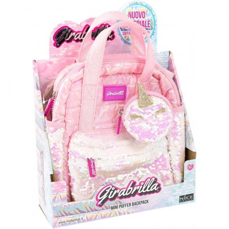 Divatos rózsaszín mini hátizsák puha, opálos anyagból készült, tartalmaz színes flitteres zsebeket és egyedi unikornis formájú pénztárcát.