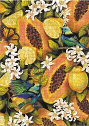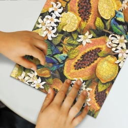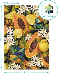 Fedezze fel minden részletét ennek a gyönyörű kirakónak, ahol a trópusi gyümölcsök színes és részletes megjelenítése találkozik a pontosan illeszkedő darabokkal. Befejezés után a kirakó mérete körülbelül 48 x 64 cm.