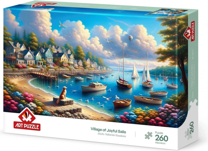 Puzzle vitorlásokkal teli kikötő témával, 260 darab, mérete 48x34 cm, a nyugalom és az összeállítás szerelmesei számára.