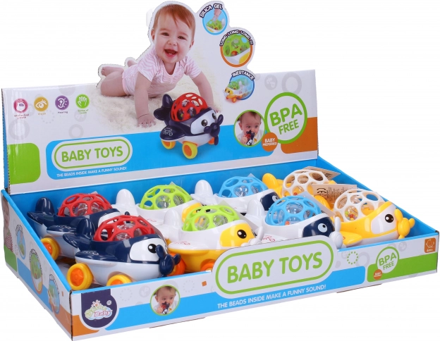 A repülőgép formájú játék szabad kerekekkel tökéletes szórakozást és fejlődést nyújt a gyerekeknek. Ezek a csörgők négyféle színváltozatban kaphatók: kék, zöld, fehér és piros. A 11x11x8 cm-es mérete miatt könnyen megfogható és mozgatható a gyerekek számára.