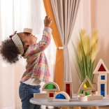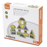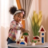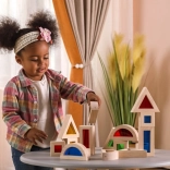 Ez a 16 darab gondosan megmunkált fa kockából álló készlet színes, átlátszó betétekkel végtelen lehetőséget kínál az építésre, válogatásra és a fények és színek felfedezésére. A gyerekek tornyokat, házakat vagy hidakat építhetnek, miközben fejlődik térérzékelésük és logikus gondolkodásuk.