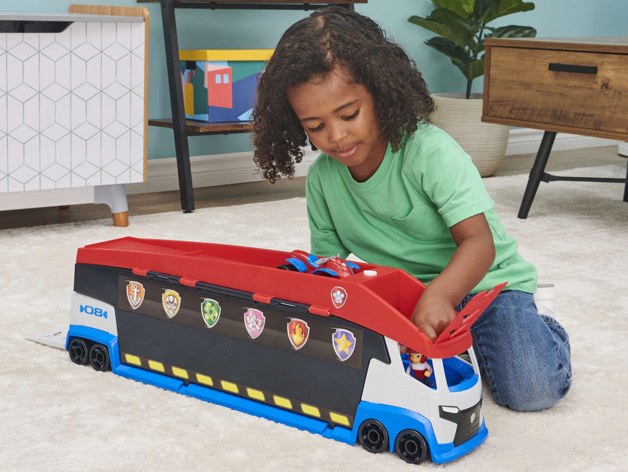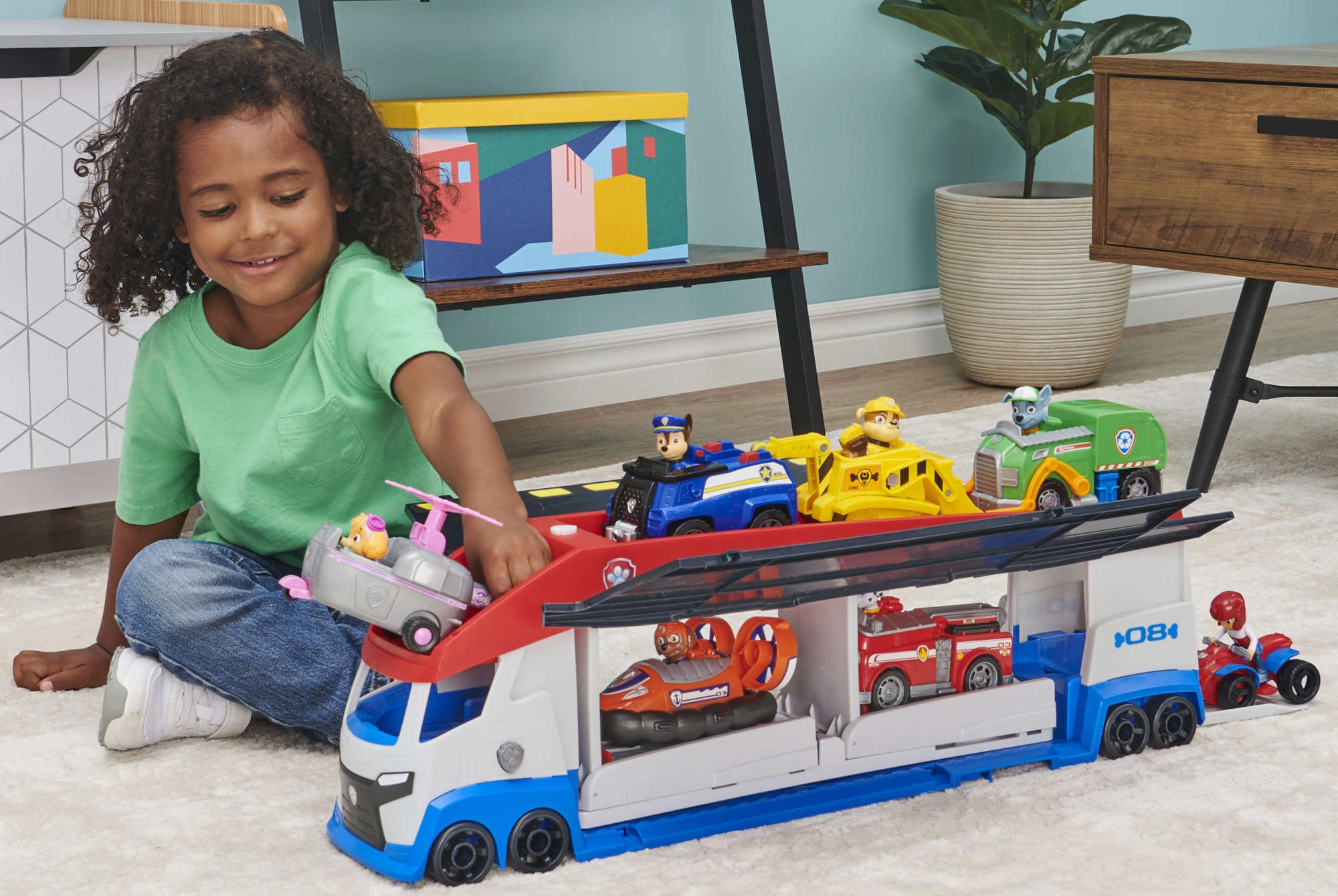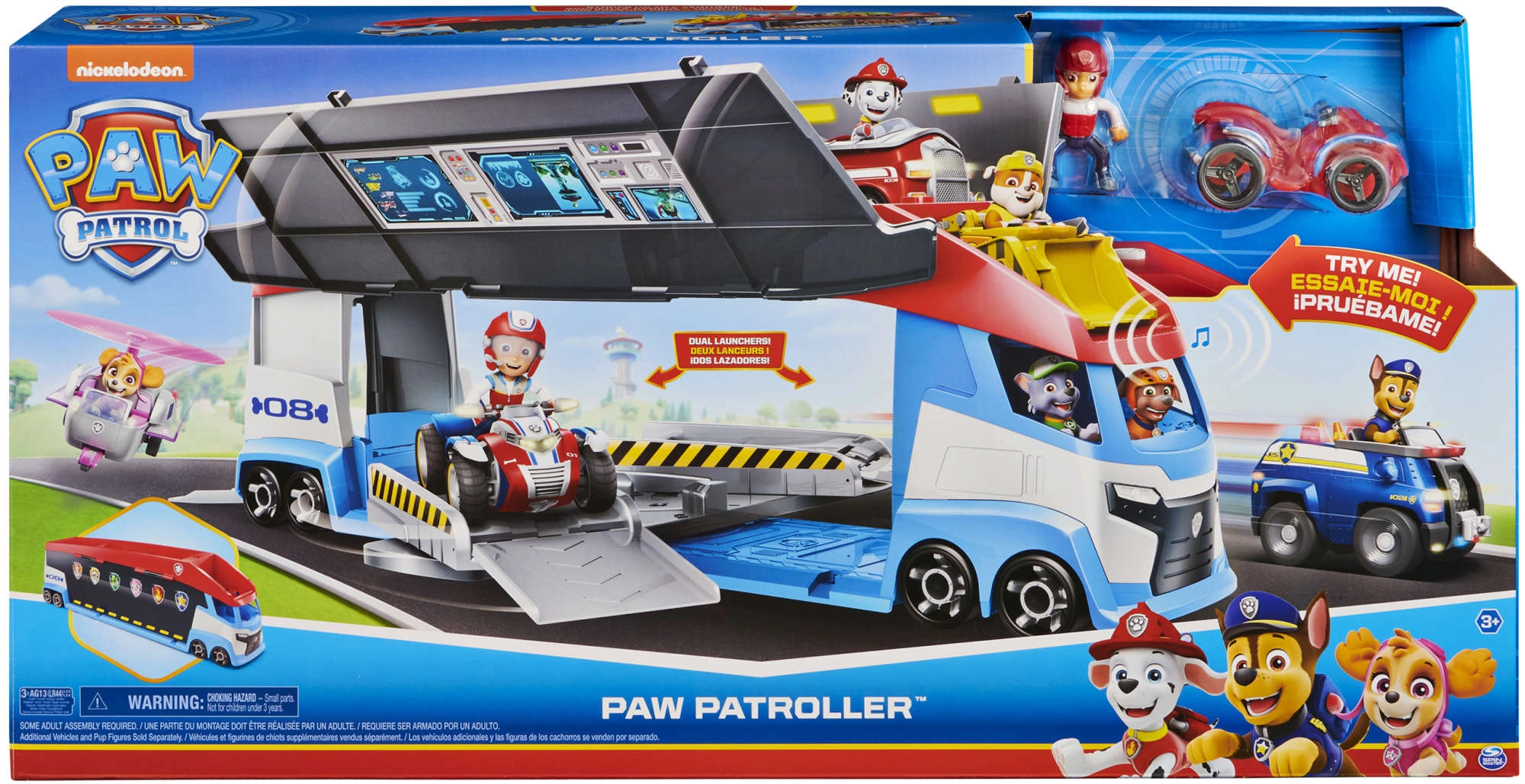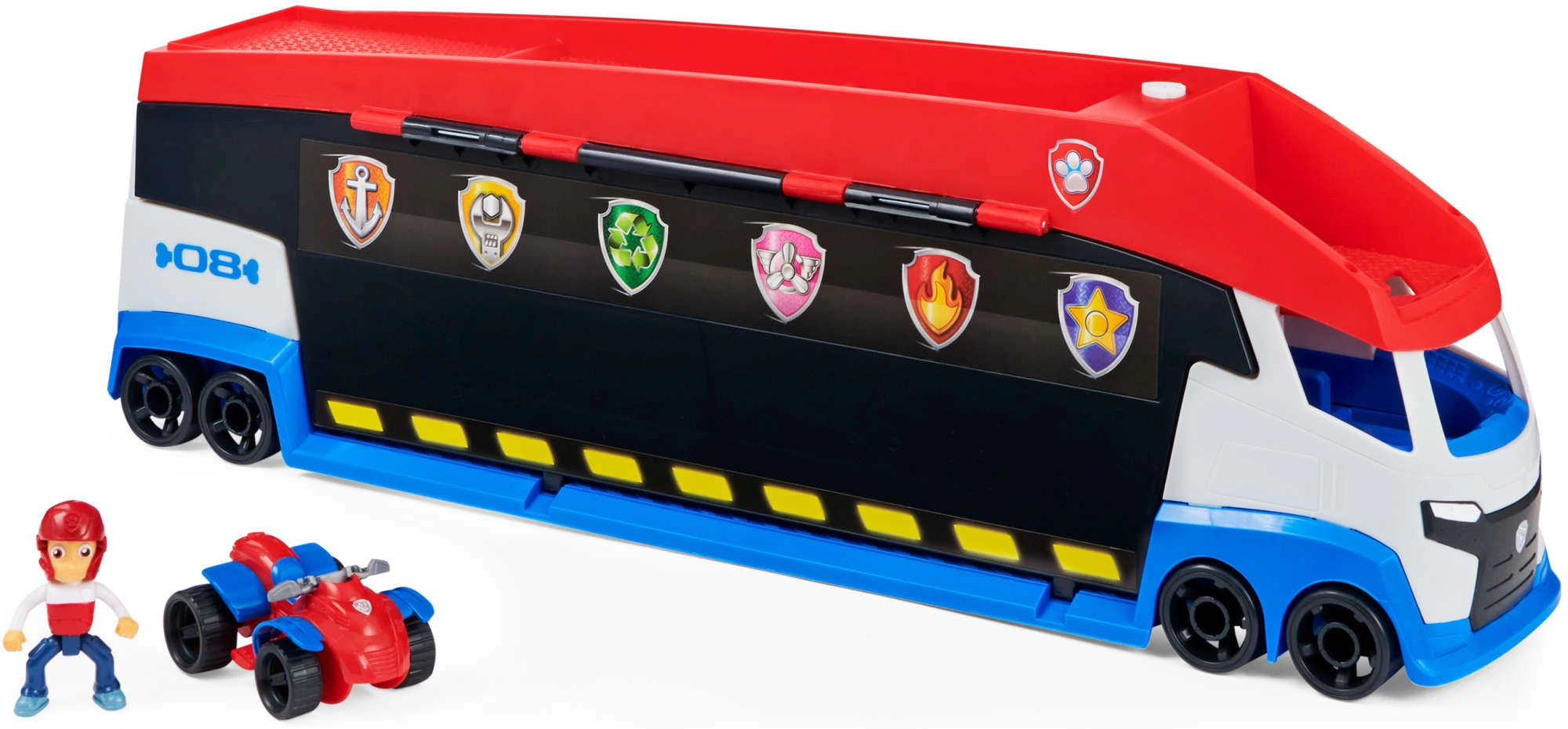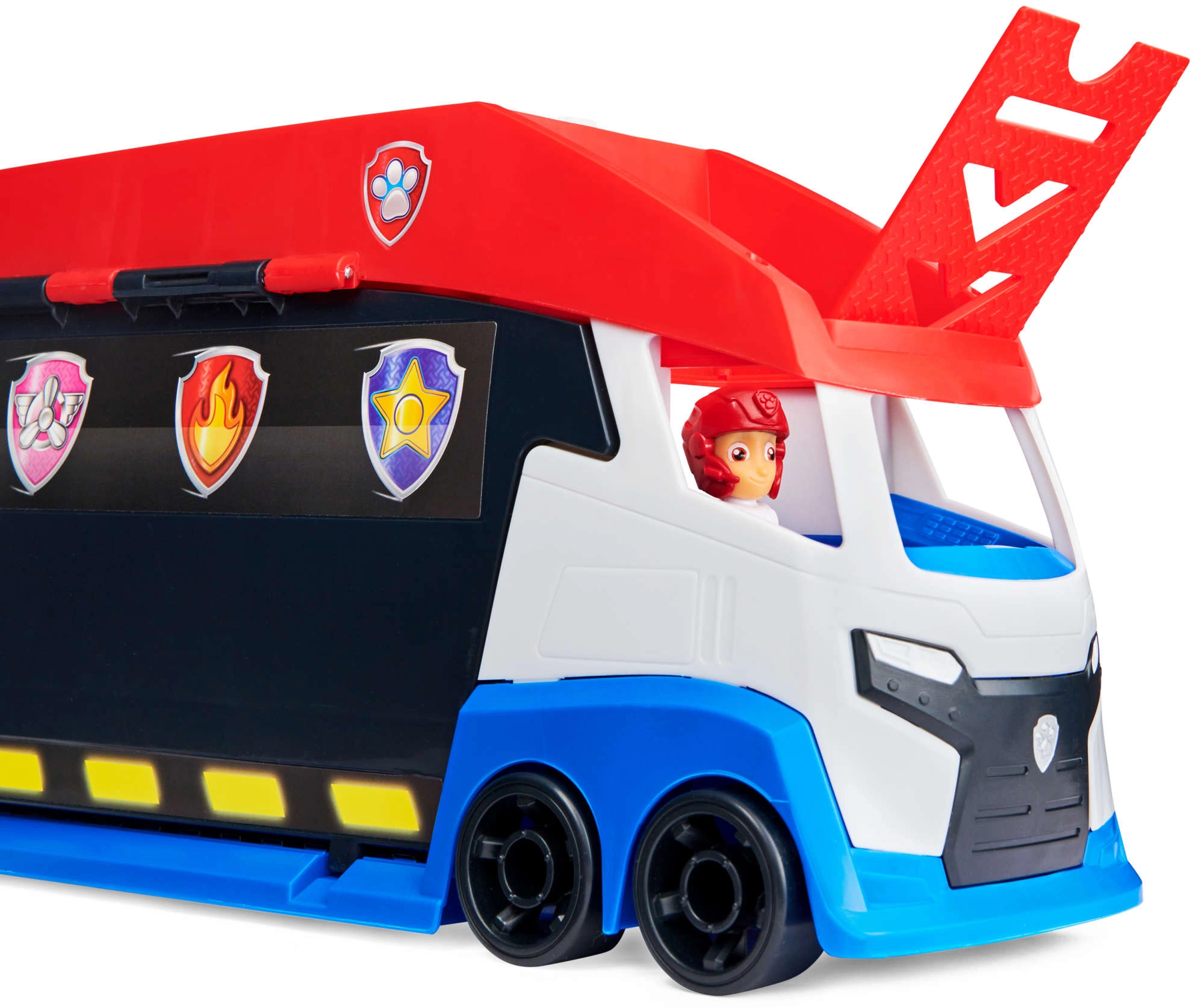 A járőr könnyedén akár 6 járművet szállít (kompatibilis a standard PAW PATROL autókkal), 2 kilövővel rendelkezik a gyors akciókezdéshez és felnyíló oldalsó ajtókkal a zökkenőmentes felhajtáshoz. A mellékelt Ryder figura és a quad segítségével a gyerekek azonnal bevetésre indulhatnak.