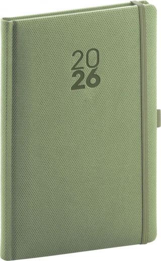 Elegáns Heti napló Diamante 2026 olíva színben finom szerkezettel, mely emlékeztet a gyémántcsiszolásra, ideális személyes és munkahelyi tervezéshez.