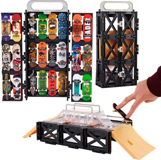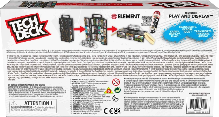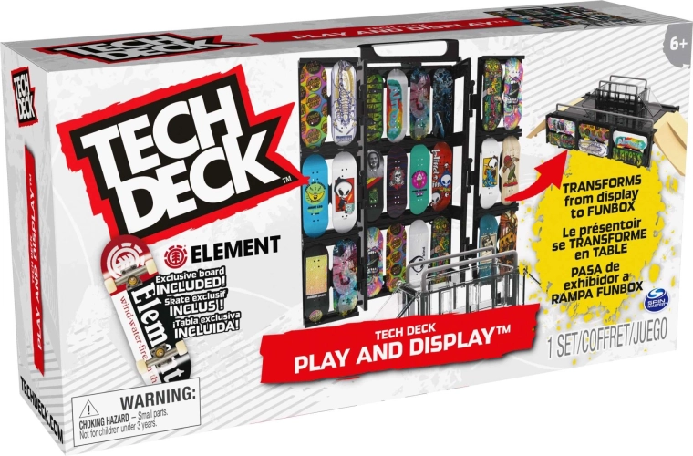 A Tech Deck Play and Display egy okos 2 az 1-ben megoldás: állvány és tároló tok a gyűjteményedhez, valamint egy teljes fingerboard skatepark trükkökhöz. A ládás kialakítás könnyen funboxszá hajtható rámpákkal és grind korlátokkal, így otthon és útközben is gurulhatsz. A csomag tartalmaz egy stílusos ELEMENT fingerboardot az azonnali menetre.