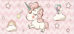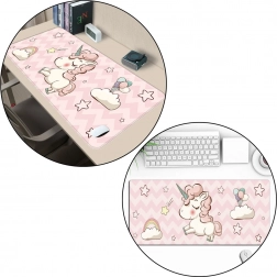 A párna puha, de tartós gumiból készült, amely stabil tapadást biztosít az asztal felszínén, és megakadályozza az elcsúszást. Az anyag felső rétege kellemes tapintású és kopásálló. A rózsaszín design egyszarvú, felhő és csillag mintákkal mesés hangulatot áraszt és feldobja a teret.