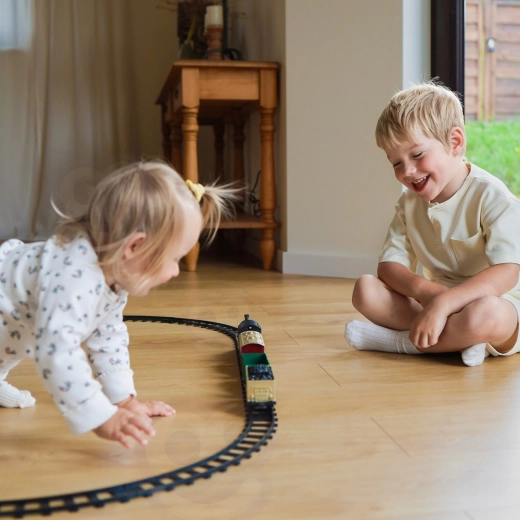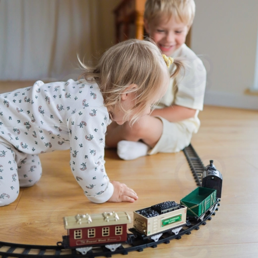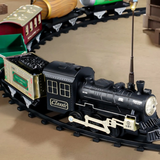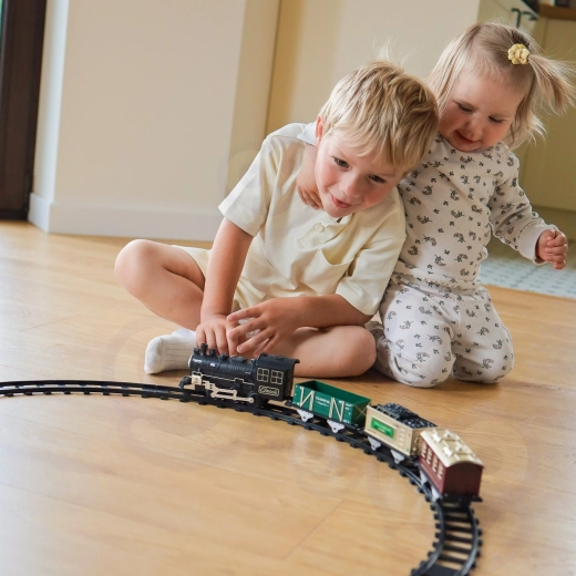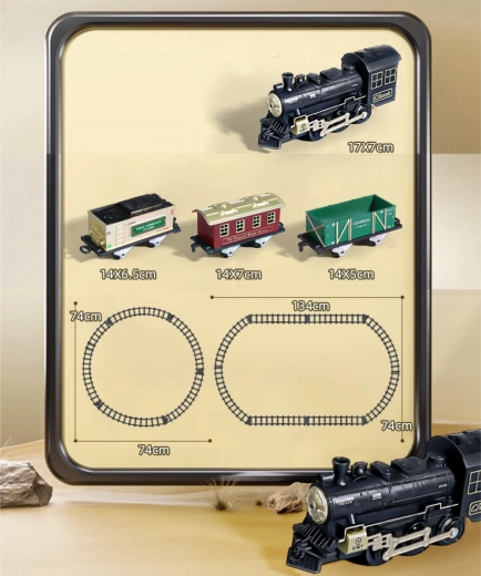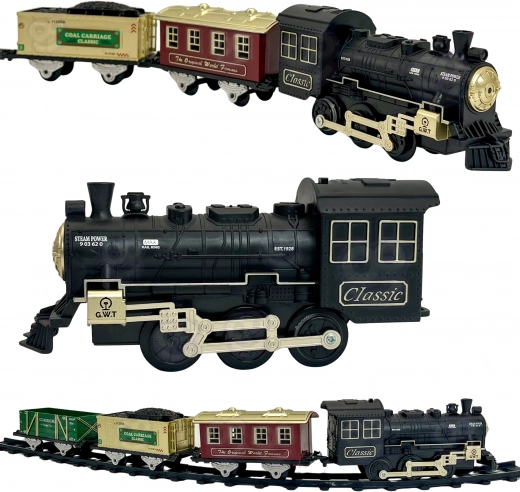 Ez a hagyományos gőzös készlet hiteles vonatozási élményt nyújt a gyerekeknek. A mozdony világító fényszóróval és valósághű hangokkal fokozza a játék hangulatát. A sínek egyszerűen összekattinthatók, így pillanatok alatt megépíthető egy kb. 74 cm átmérőjű kör vagy egy kb. 134 × 74 cm-es ovális.