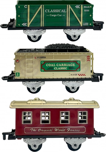 A csomag tartalmaz egy személyvagont, egy szénszállító kocsit és egy tehervagont, hogy a jelenetek a személyszállítástól az áruszállításig sokfélék lehessenek. A könnyű, biztonságos kialakítás ideális beltéri játékhoz, és fejleszti a kreativitást, a képzelőerőt és a logikus gondolkodást.