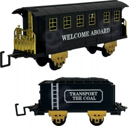Két részletgazdag kocsi tartozik hozzá – szeneskocsi és személyvagon. Könnyen kapcsolhatók és simán futnak a pályán.