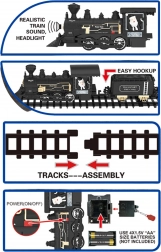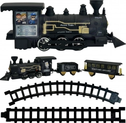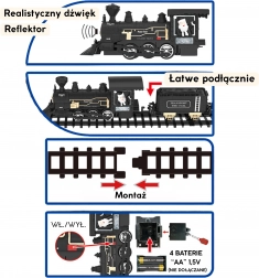 - Teljes készlet: mozdony fénnyel és hangokkal, szeneskocsi, személyvagon, 8 íves és 4 egyenes sín