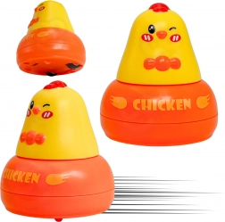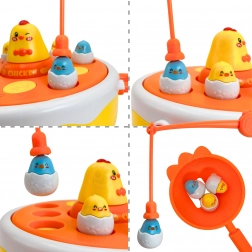 Ez a sokoldalú játék akár négyféle tevékenységet is egyesít egy készletben, így a gyerekek sokáig nem unják meg. A zenélő, forgó alap véletlenszerűen megemeli a csibéket, amelyeket mágneses bottal lehet kifogni vagy a katapultról kilőve lapátkákkal elkapni. A nagyobb, levehető csibe vidám kisautóként használható.