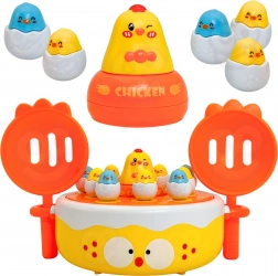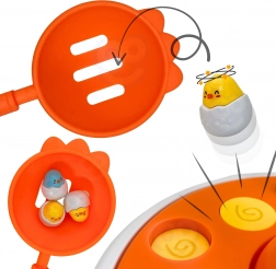A dallamokat játszó, forgó alap véletlenszerűen „felpattintja” a csibéket, így a gyerekek gyakorolják a figyelmet és a koordinációt az elkapás során.