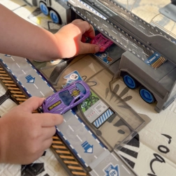 A kamion mozgó szállítóként és hordozható bőröndként is funkcionál a kisautók és kiegészítők számára. A gyerekek így könnyedén bárhová magukkal vihetik a teljes szettet.