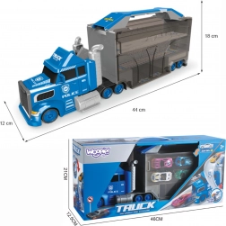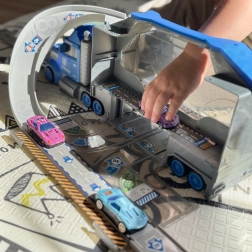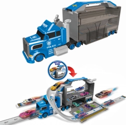 A WOOPIE márka nagy rendőrségi kamionja pillanatok alatt átalakul a kisautók szállító szerelvényéből teljes értékű versenyszetté garázzsal és pályával. A pótkocsi kinyitásával feltárul a belső játéktér rámpákkal, hurkokkal és táblákkal, ahol a gyerekek izgalmas versenyeket és párbajokat rendezhetnek.