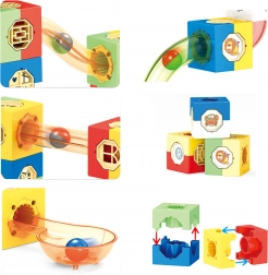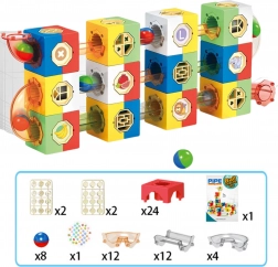 Ez a kreatív készlet lehetővé teszi a gyerekek számára, hogy saját fantáziájuk szerint tervezzenek és átépítsenek egyedi golyólabirintusokat. A kockák, egyenes elemek, lejtős pályadarabok és az átlátszó csövek kombinációjának köszönhetően a golyók futásának megfigyelése lebilincselő és edukatív – fejleszti a logikát, a finommotorikát és a térbeli gondolkodást.