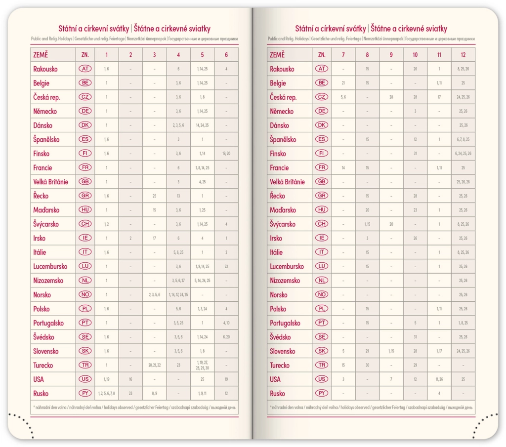 - Heti beosztás cseh-szlovák naptárral, amely kiegészül angollal, némettel, magyarral és orosszal.