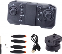 D6 Pro drón, távirányító, kiegészítő kameramodul, akkumulátor, USB-kábel, 4 pótpropeller, 4 propellervédő, csavarhúzó, hordtáska