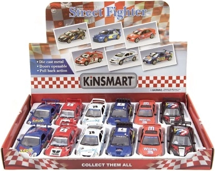 Fedezze fel a sebesség és a szórakozás világát a KINSMART Street Fighter mini versenyautókkal. A fém karosszéria műanyag kiegészítőkkel garantálja a tartósságot, valamint a precíz részletkidolgozást, mint a versenymatricák, spoilerek és sportfelnik.