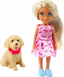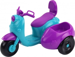 A baba egy háromkerekű robogón utazik intenzív türkiz-lila színben. A robogó oldalán található pótkocsi egy piros nyakörvvel rendelkező kis kutyát rejt, aki hűséges útitárs minden utazáson. A szett tartós, biztonságos műanyagból készült, ideális a mindennapi játékhoz.