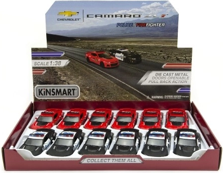 Stílusos Chevrolet Camaro modell a Kinsmart márkától rendőrségi vagy tűzoltó kivitelben. Fém-műanyag felépítés, visszahúzós meghajtás a fürge haladáshoz, valamint részletgazdag minták és belső tér, amely örömet szerez gyerekeknek és gyűjtőknek egyaránt. 3 éves kortól ajánlott.