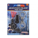 Szuper rendőrségi készlet gyerekeknek, amely tartalmaz egy tapadós lövedékekkel ellátott pisztolyt, bilincset és adó-vevőt. Ideális szórakozás kis rendőrök számára, tartós műanyagból készült.