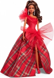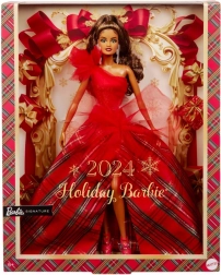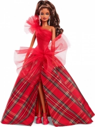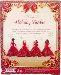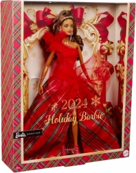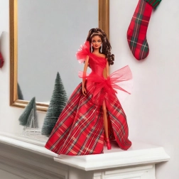 A Barbie Ünnepi 2024 lélegzetelállító élénkpiros fűzős ruhát visel, amely egyvállas kialakításával gyönyörűen párosul klasszikus kockás mintájú, bő báltermi szoknyával. A nagyméretű tüll díszítések modern karaktert kölcsönöznek a klasszikus stílusnak, míg a feltűnő fülbevalók kiemelik az összes eleganciát. A baba kiállításra alkalmas csomagolásban érkezik, ami remek ajándékká teszi gyűjtők vagy az ünnepi dekoráció részeként.