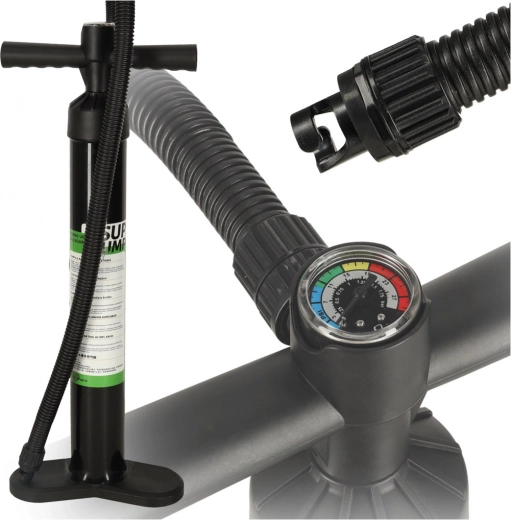 Kézi nagynyomású pumpa SUP-hoz elengedhetetlen eszköz a SUP deszkák és más felfújható termékek gyors és hatékony felfújásához. A beépített nyomásmérőnek köszönhetően pontosan ellenőrizheted a nyomást az optimális felfúvás érdekében. A pumpa stabil lábakkal rendelkezik, amelyek biztosítják a stabilitást a pumpálás során, illetve a 'T' fogantyúval, amely kényelmes és biztos fogást nyújt, ami elengedhetetlen a kényelmes munkavégzéshez. Ezzel a pumpával gyorsan előkészítheted a deszkádat a vízi kalandokhoz!