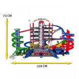 A garázs 6 fém játékautót, elemes vonatot, automatikus váltókat, baleset funkciós alagutat és 2 motorizált liftet is tartalmaz. Az összeszerelés utáni méretek: 128 x 78 x 73 cm.