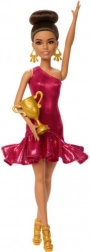Csillogó, piros, egyvállas ruhába öltözve, amely tökéletesen illik az arany fülbevalókhoz és magassarkú cipőkhöz, Barbie készen áll a nagy győzelmére.