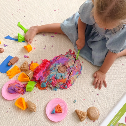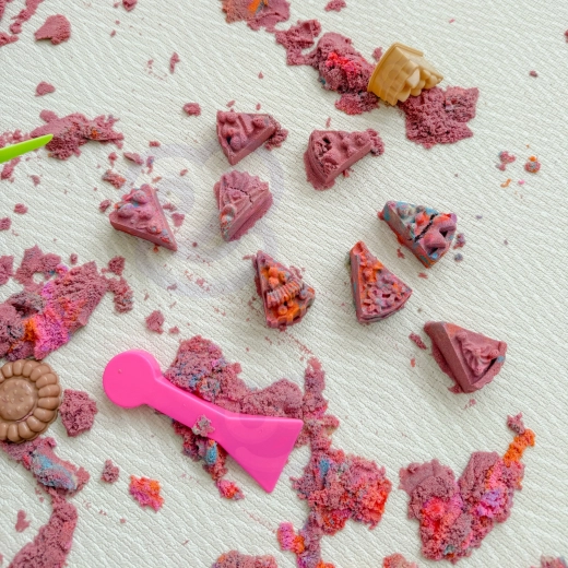A homok speciális összetétele kellemes tapintású, könnyen vágható, nyújtható és formázható, miközben nem szárad ki és tartja a formát. A gyerekek „főzhetnek” és tálalhatnak desszerteket tányérokra, használhatnak lapátokat, késeket és nyújtófát, valamint részletgazdag textúrákat készíthetnek préselő kiegészítőkkel.