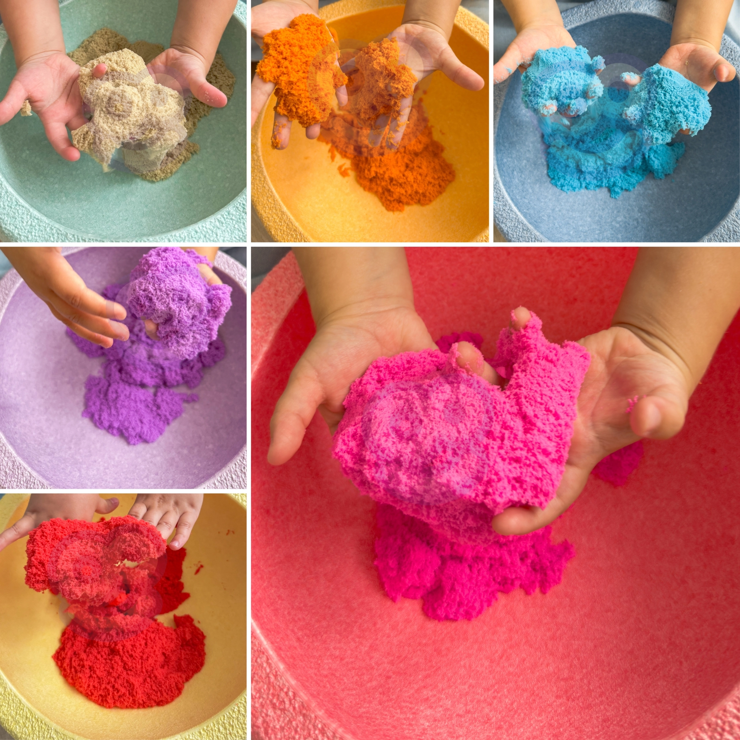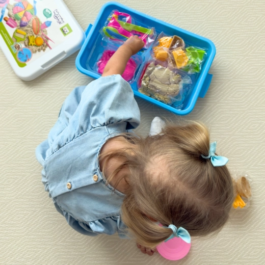 A homok puha, formázható, nem szárad ki és nem ragad a kézhez vagy a felületekhez. Fejleszti a finommotorikát, a koordinációt és a képzelőerőt.