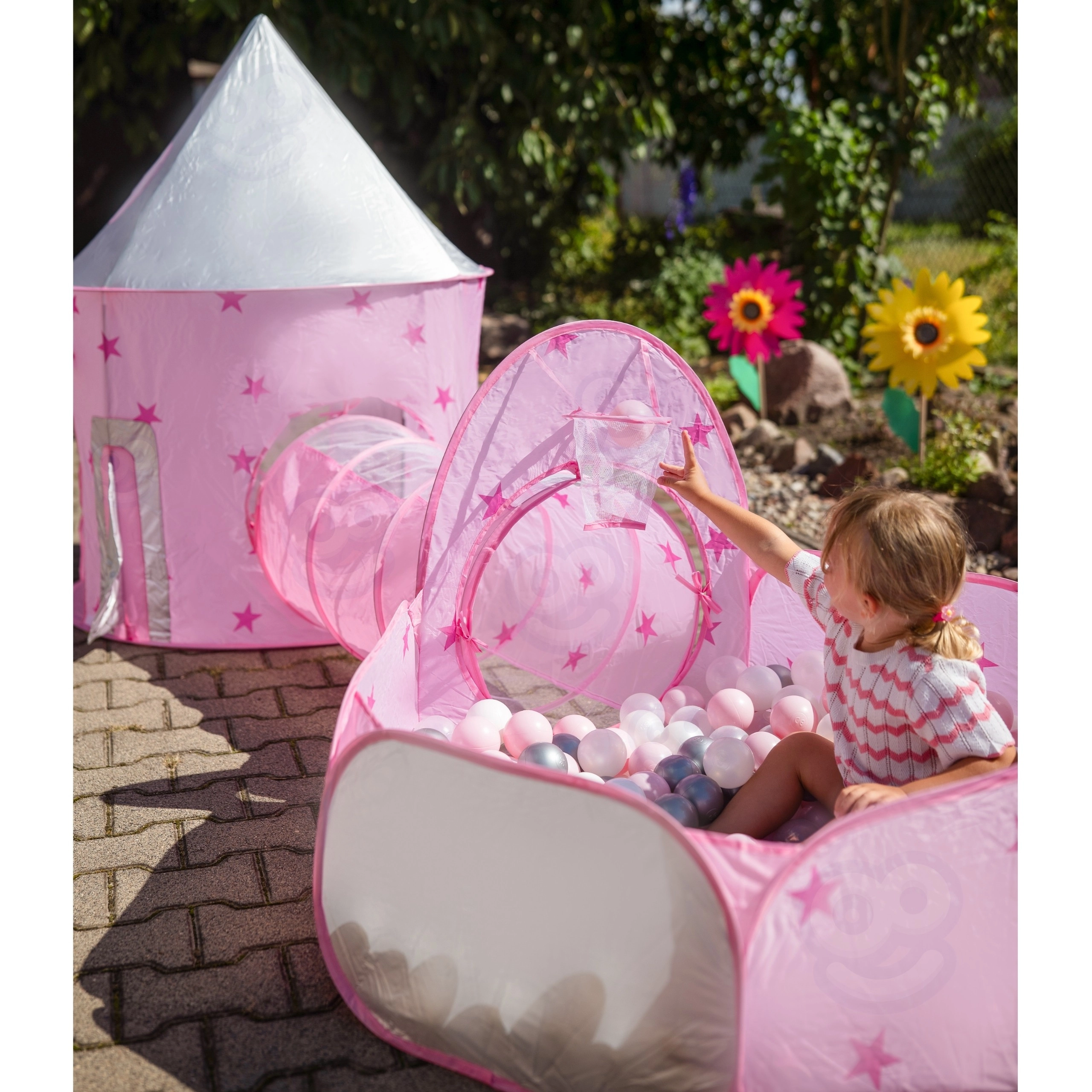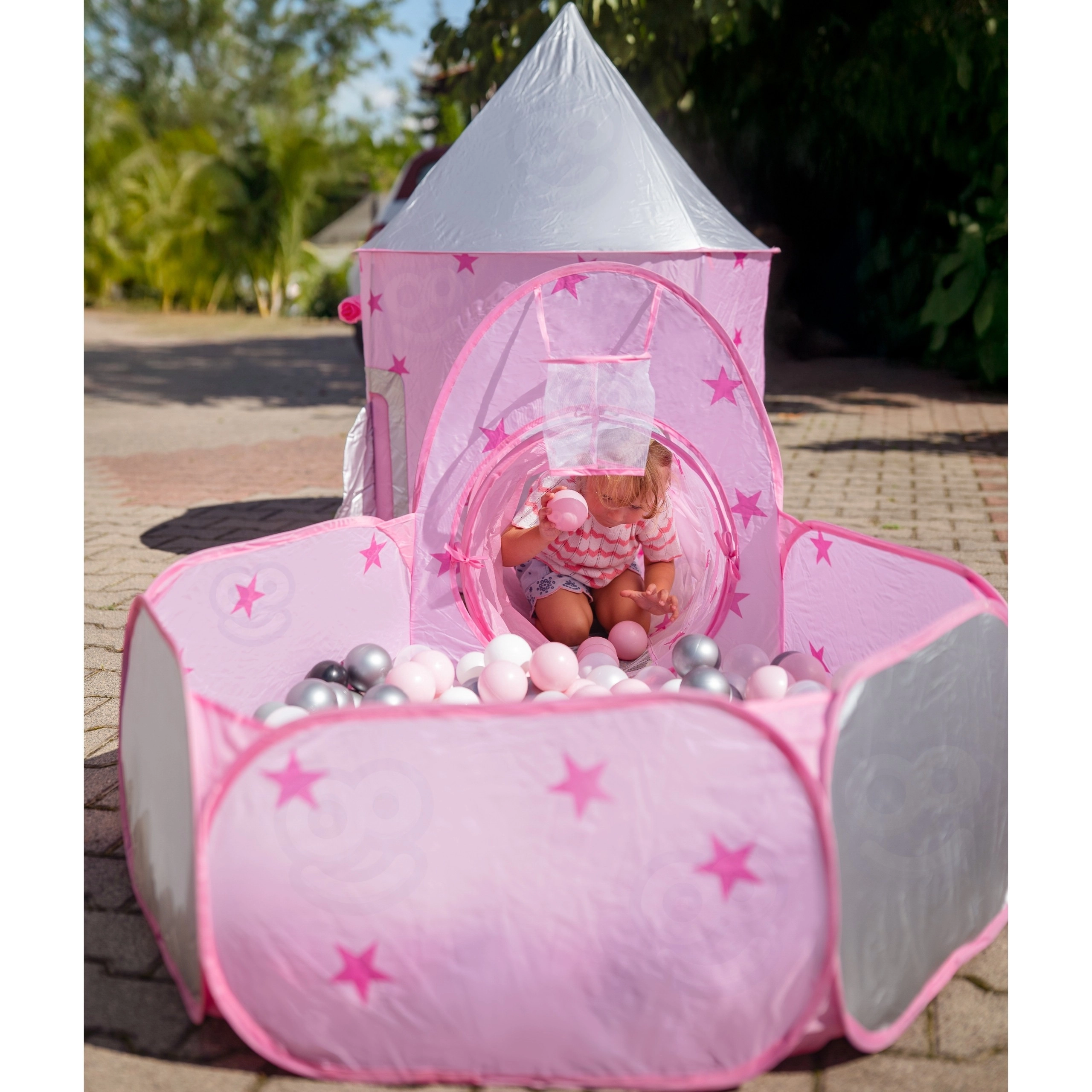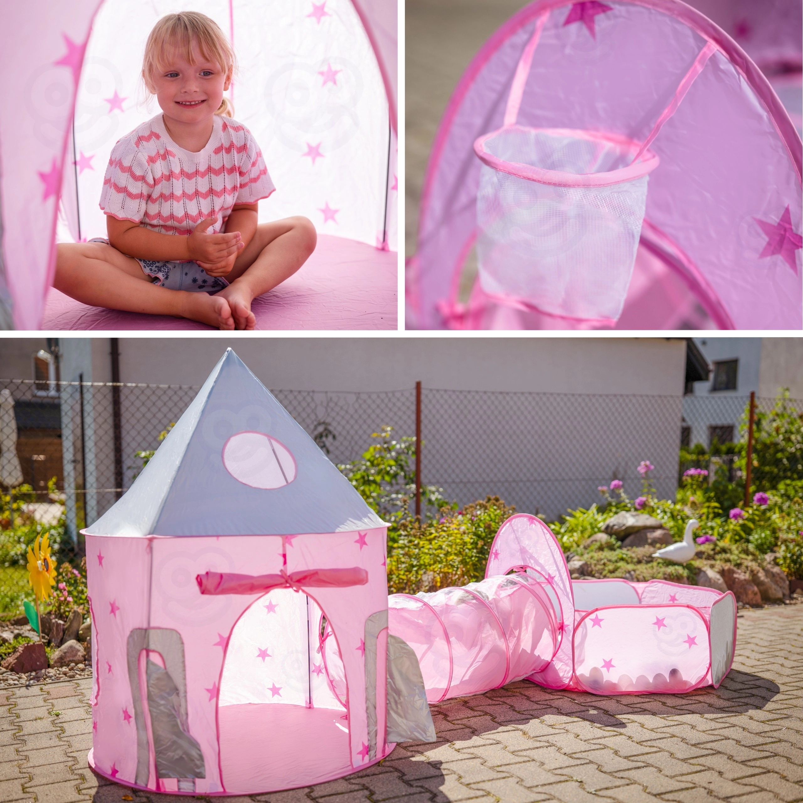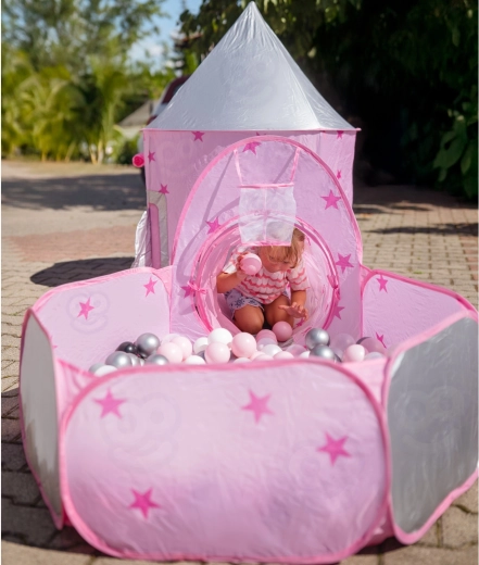 A szett központi eleme a rózsaszín, palotára emlékeztető sátor hálós ablakokkal és feltekerhető ajtóval. Tökéletes rejtekhely kis hercegnőknek és lovagoknak, valamint a fantáziajátékok központja.