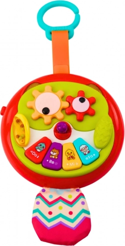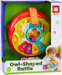 A bagoly hasán egy színes zongora található, amely megnyomásakor kellemes dallamokat játszik, így támogatva a hallás fejlődését és a hangok megkülönböztetésének képességét. A bagoly farka suhogó anyagból készült, amely stimulálja a tapintást és a hallást egyaránt. A játék felszerelhető fogantyúval rendelkezik, így rögzíthető babakocsira, kiságyra vagy autósülésre is. A játék két AAA elemmel működik (nem tartozék) és kompakt méretének köszönhetően ideális utazáshoz is.