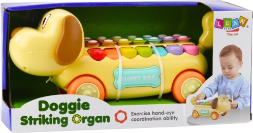 A gördülő kiskutya teljes színskálájú cintányérokkal van felszerelve, amelyeket a mellékelt kis ütővel lehet megszólaltatni. Az ütő játékhoz rögzítése egy zsinórral megakadályozza annak elvesztését intenzív játék közben is. A kiskutya tartós és biztonságos anyagokból készült, kialakítása támogatja a szem-kéz koordináció, a finom motorikus készségek és a zenei érzékenység fejlődését. Ideális oktatójáték a 18 hónapos kortól gyermekek számára.