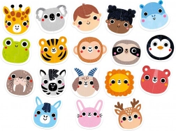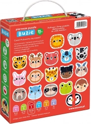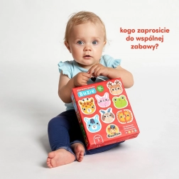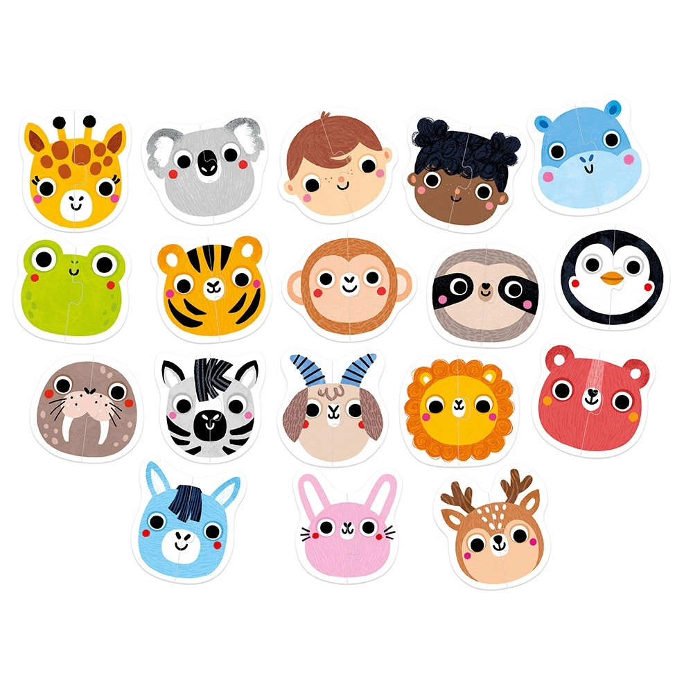 Mit talál a dobozban? Akár 18 két részes puzzle állati arcokkal és 2 gyermek arcával, ami rengeteg lehetőséget kínál a kicsik szórakoztató játékához!
