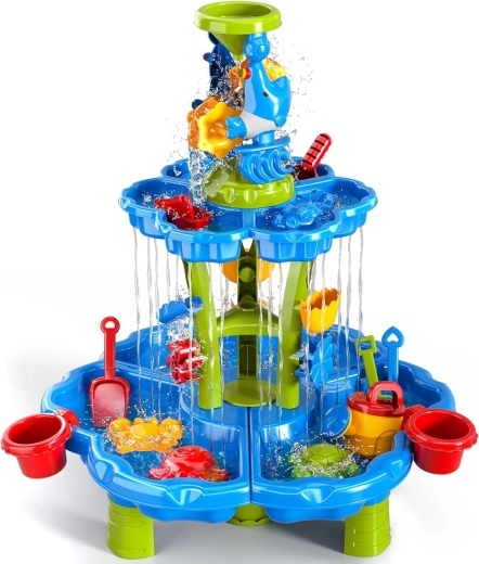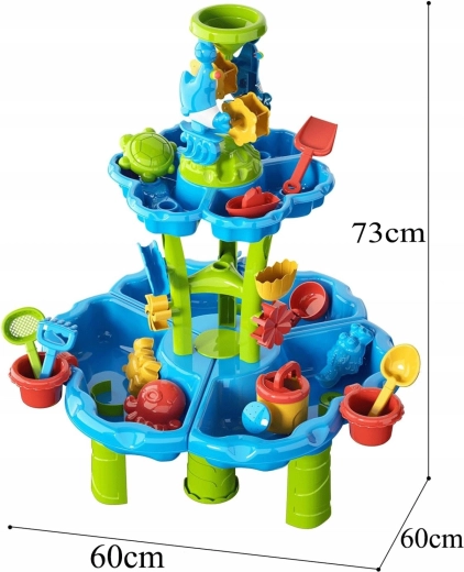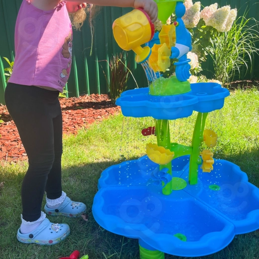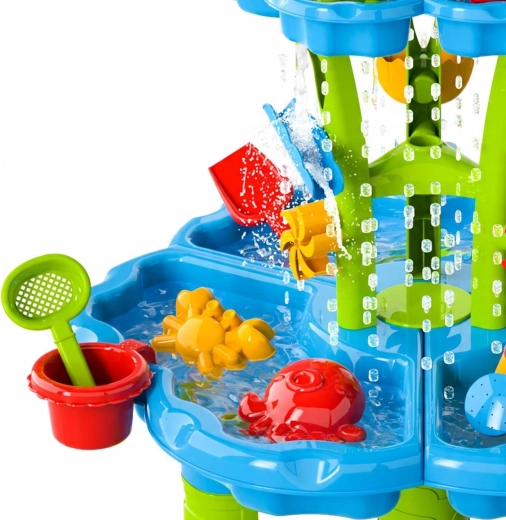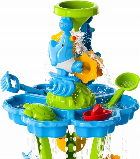 Alkoss a gyerekeknek saját mini aquaparkot! Az asztal három önálló rekeszt kínál – az egyiket megtöltheted vízzel, a másikat homokkal, a harmadikat pedig keverésre és kísérletezésre hagyhatod. A víz kaszkádos csatornákon folyik át, megforgatja a kerekeket és kapukon zúdul tovább, így a gyerekek jól látható ok-okozati összefüggéseket figyelhetnek meg, miközben fejlődik a finommotorikájuk.