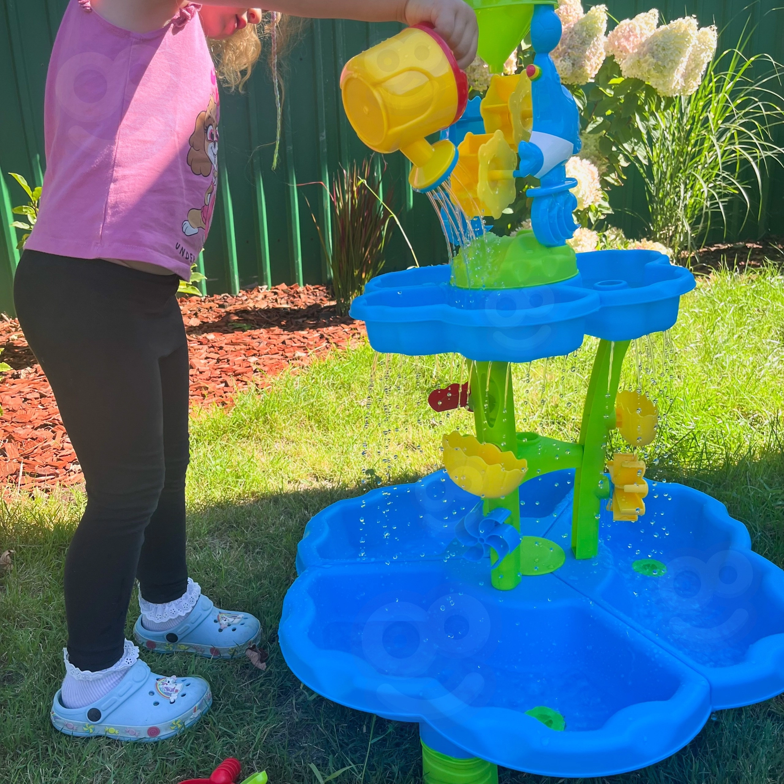 A víz több szinten át folyik, megforgatja a kerekeket és mini vízeséseket hoz létre, melyek lenyűgözik a gyerekeket, és megtanítják őket az ok-okozati összefüggésekre.